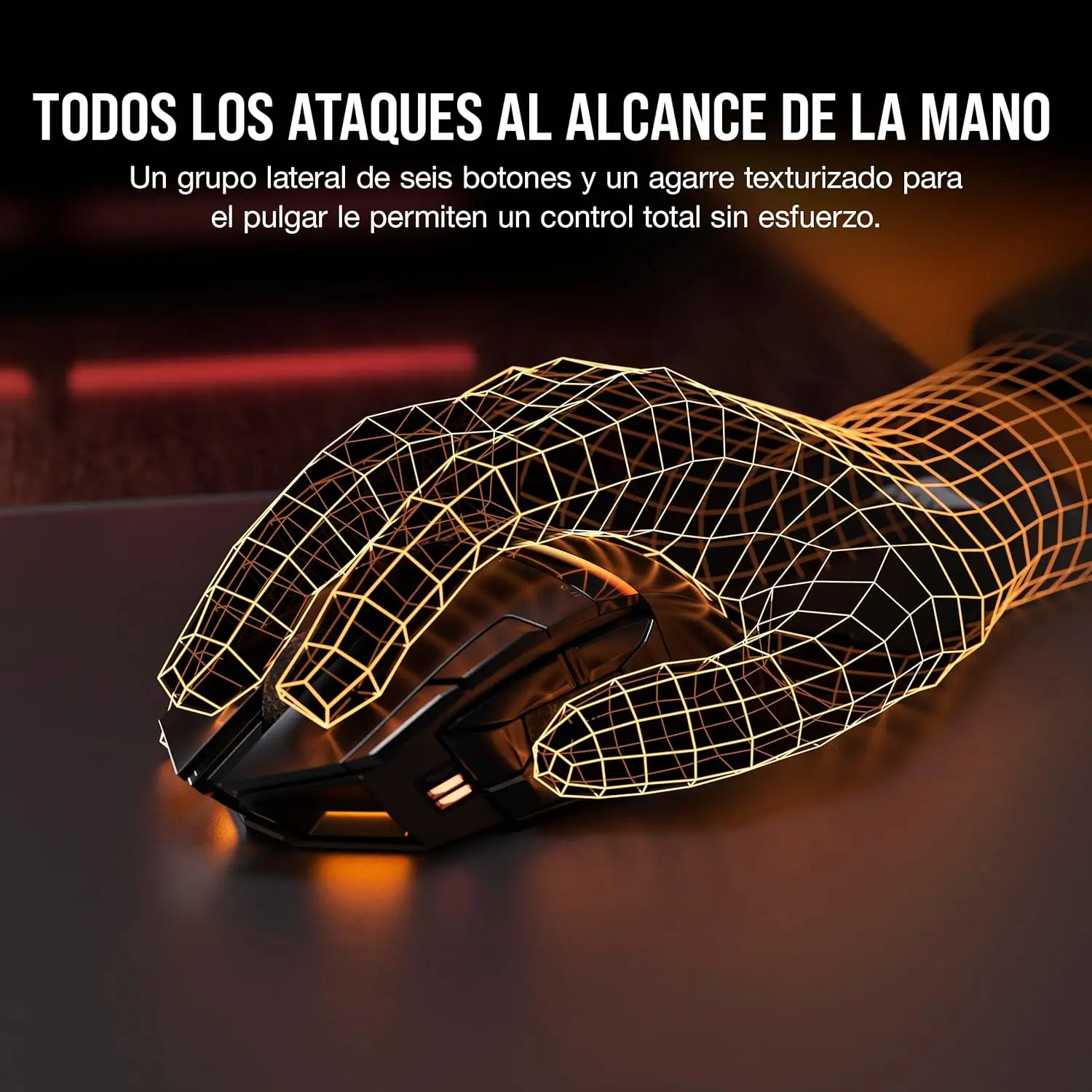 Abrazando un diseño elegante y angular, el Corsair DARKSTAR emana sofisticación y modernidad. Su acabado negro mate, complementado con acentos brillantes y detalles metálicos, lo convierte en una adición visualmente impactante a cualquier configuración de juego. El icónico logo de Corsair adorna la palma, mientras que la inscripción ‘DARKSTAR’ decora la base del botón derecho, añadiendo un toque de exclusividad.