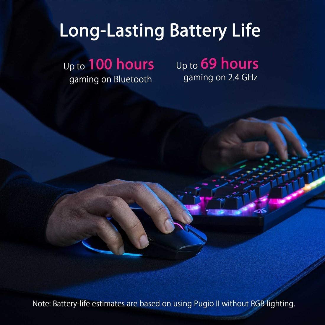 Si te gusta tener opciones, este apartado es de lo mejor del ASUS ROG Pugio II. Puedes usarlo por Bluetooth para un uso más cómodo (portátil, oficina, sofá) o tirar de receptor USB cuando quieres una conexión más enfocada a juego. Y cuando quieres olvidarte de baterías, lo conectas con cable y sigues sin interrupciones. También suma puntos el hecho de que puedas cargarlo mientras lo usas y que tenga gestión de energía para no drenar batería cuando está parado. En autonomía, está pensado para aguantar bastante si moderas la iluminación, lo que se agradece si no quieres estar pendiente del cargador cada dos por tres.