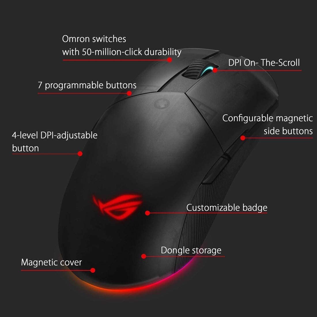 Vas bien servido: el ASUS ROG Pugio II trae nueve botones y ocho son programables. Los laterales en ambos lados son un puntazo si juegas MOBA/MMO o si quieres atajos extra para productividad. Además, el ratón está muy orientado a que lo adaptes: botones laterales intercambiables y clics principales con sockets para cambiar switches, lo que te permite ajustar el tacto del clic sin cambiar de ratón entero.